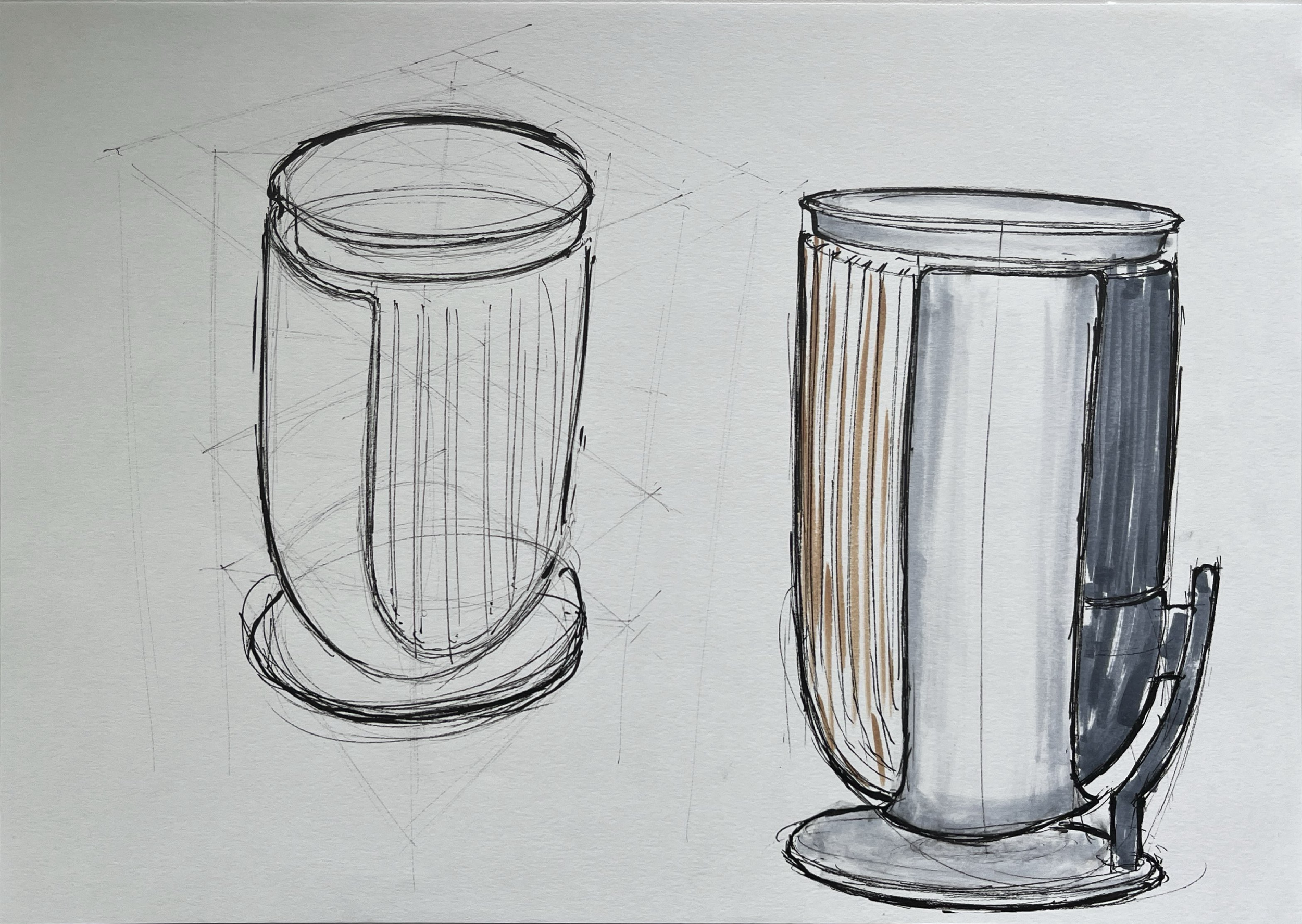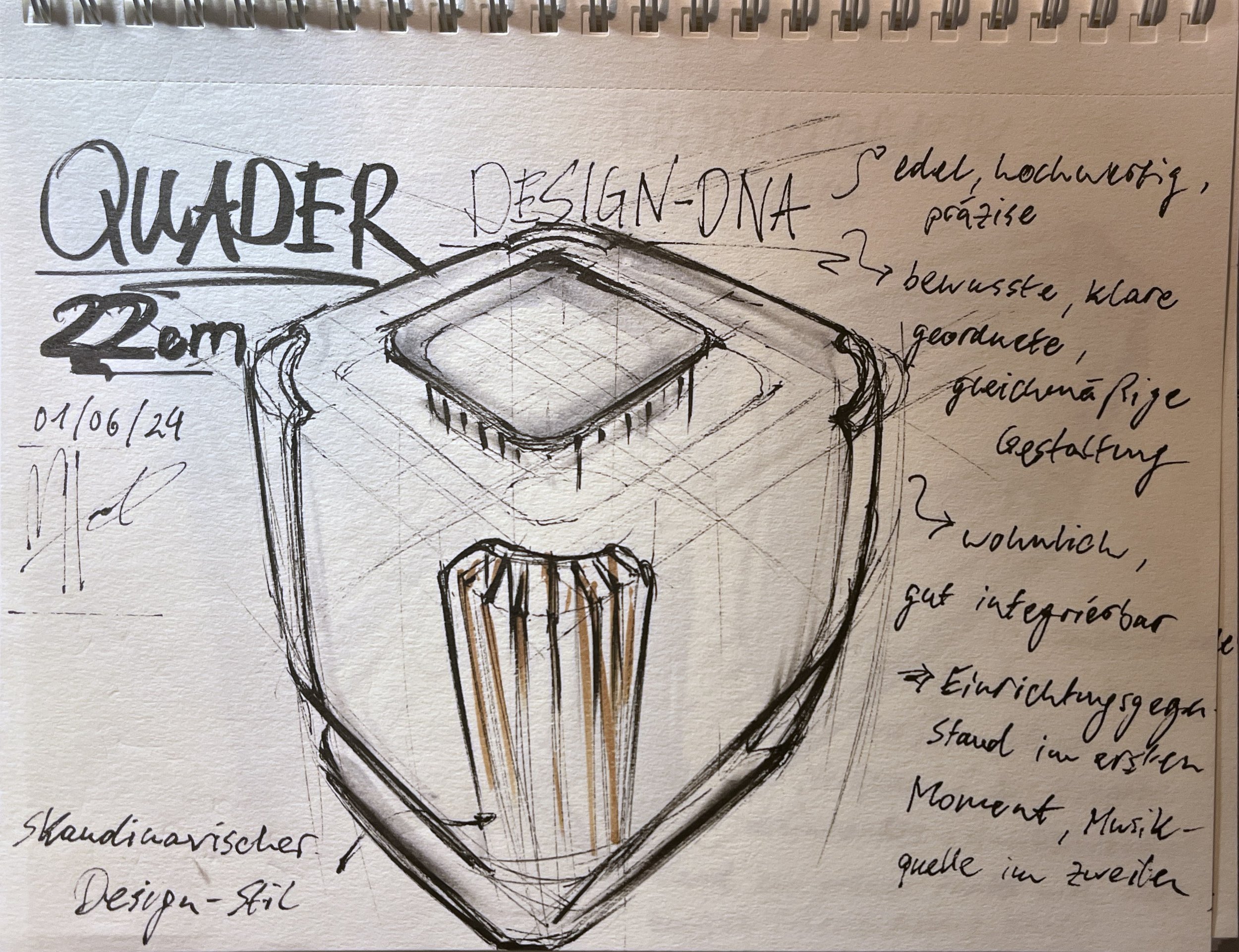 Nach einigen Skizzen und Iterationen konnte ich die Formsprache in Form eines Quaders skizzieren. Nach dieser zeichnerischen Ermittlung setzte ich mich ans CAD, um die Form durch die Konstruktion zu vali-