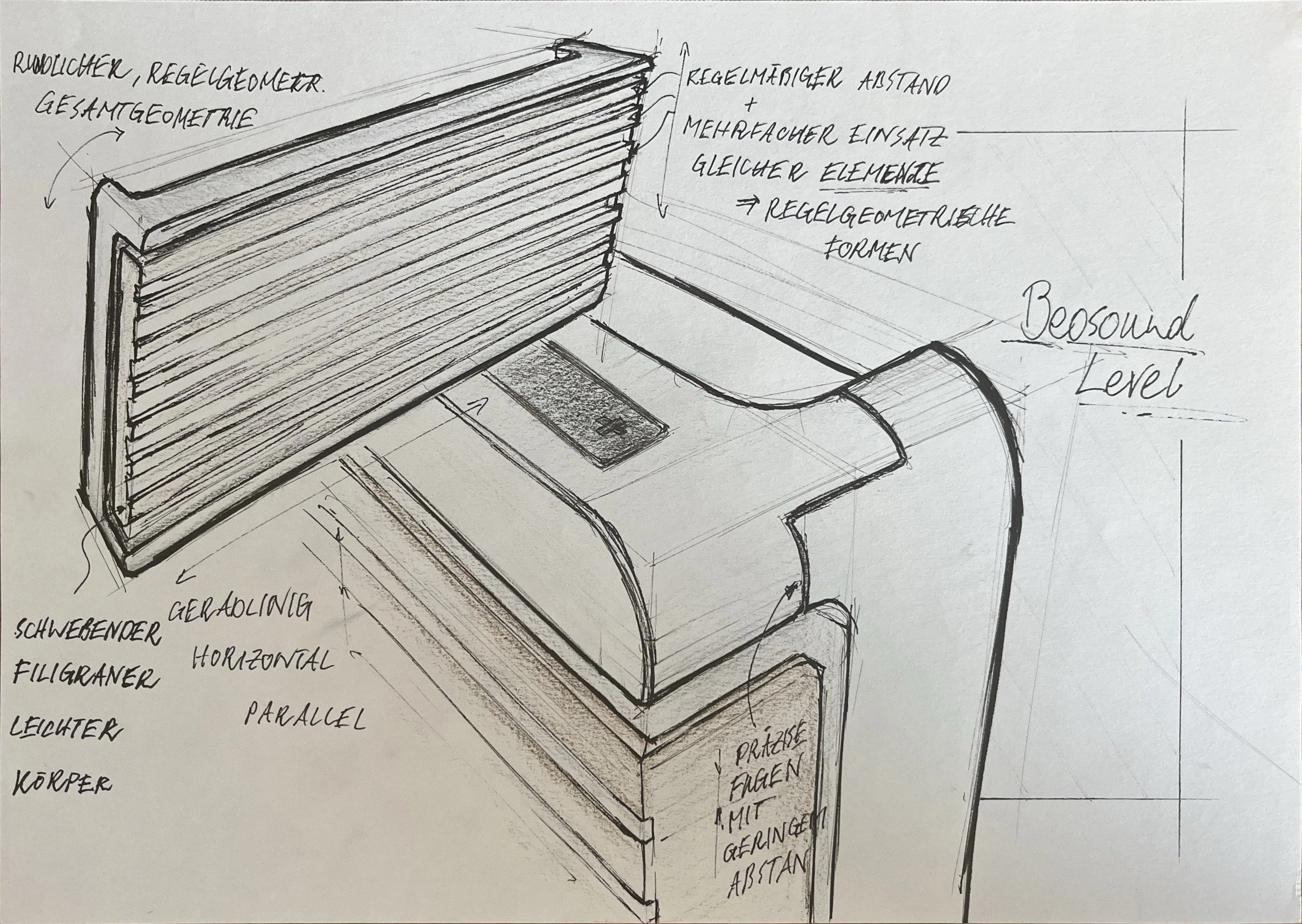 Das Moodboard auf der linken Seite definiert den Charakter der Bang & Olufsen Produkte und zeigt die Stimmung, die durch die freundliche und gleichzeitig elegante Formsprache kommuniziert wird. Der Einfluss des warmen, skandinavischen Designs lässt die Musikanlagen auf den ersten Blick mehr wie ein Einrichtungsgegenstand wirken. Gleichzeitig verkörpert der dänische Hersteller eine hohe Qualität durch den Einsatz von Holz und Aluminium, die sich bei einer hohen Fugenqualität und Maßhaltigkeit zu klaren ebenen Flächen und geraden, parallelen Kanten zusammenfügen. Die Design-DNA lässt sich dabei in zwei unterschiedliche Formsprachen aufteilen. Das Styleboard auf der linken Seite ist klassicher und konservativer. komplexere, filigrane, seriöse Geometrie. Dünnwandige (=leichte), durchgehende (=fließend, konsequent, seriös, elegant) und in der Gesamtwirkung rundliche (=freundlich) Schale (mit scharfen Kanten abrunden) als äußere Hülle (=Geborgenheit) mit dahinterliegendem Körper