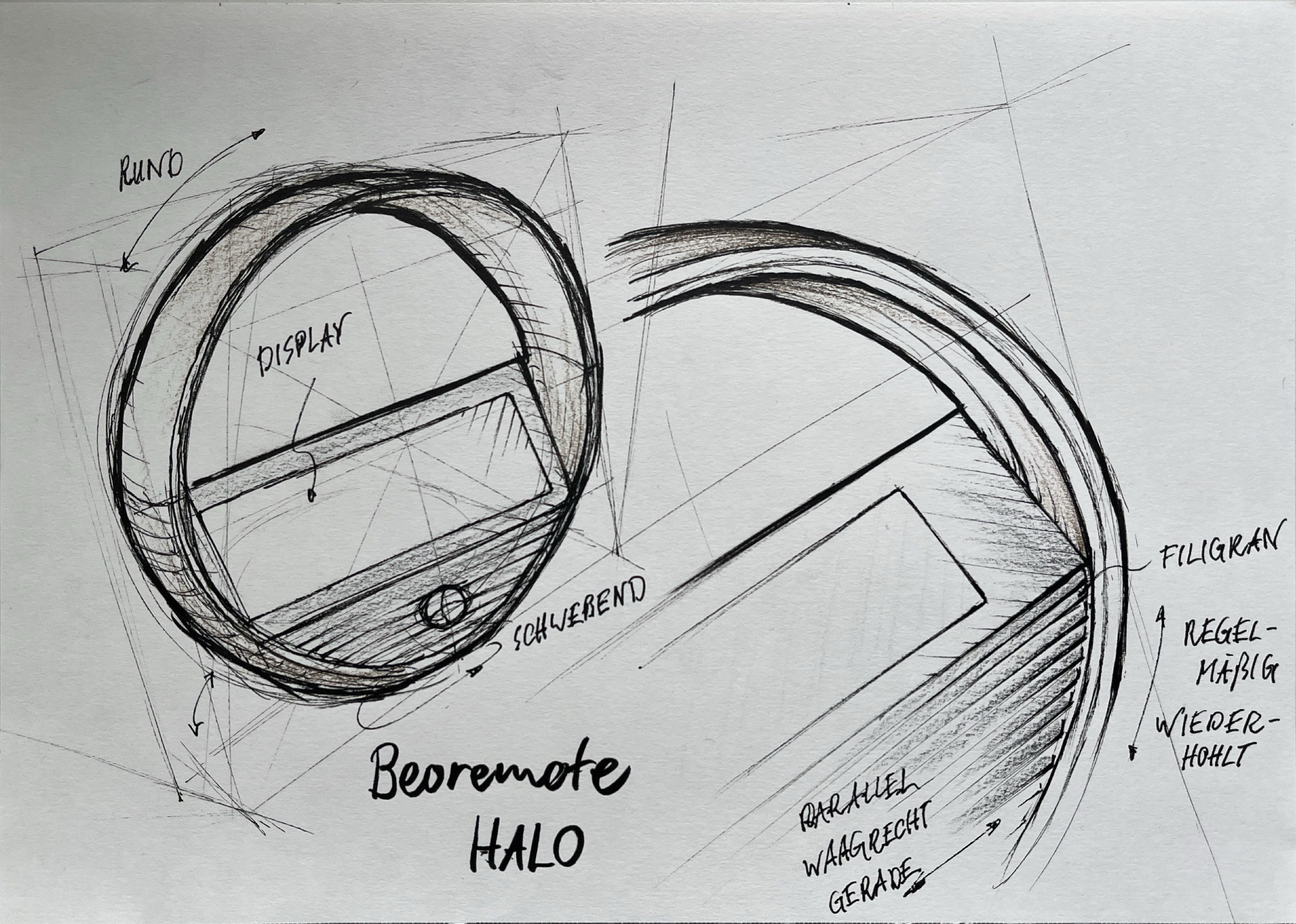 Nach der rein visuellen Analyse, skizzierte ich ein paar der Produkte um die Formsprache noch besser zu verstehen und sie im nächsten Schritt auf den voregegebenen Quader zu übertragen. Auffällig waren hier die aufgeräumten, klaren Flächen. Wenn mehr los war, wiederholen sich die Elemente mit gleichem Abstand. Sehr symmetrische beziehungsweise koaxial angeordnete Elemente zeichnen die Geometrie aus. Nach Übertragung des Designs auf einen Quader, soll im zweiten Schritt ein Fahrradhelm in der gleichen Formsprache gestaltet werden