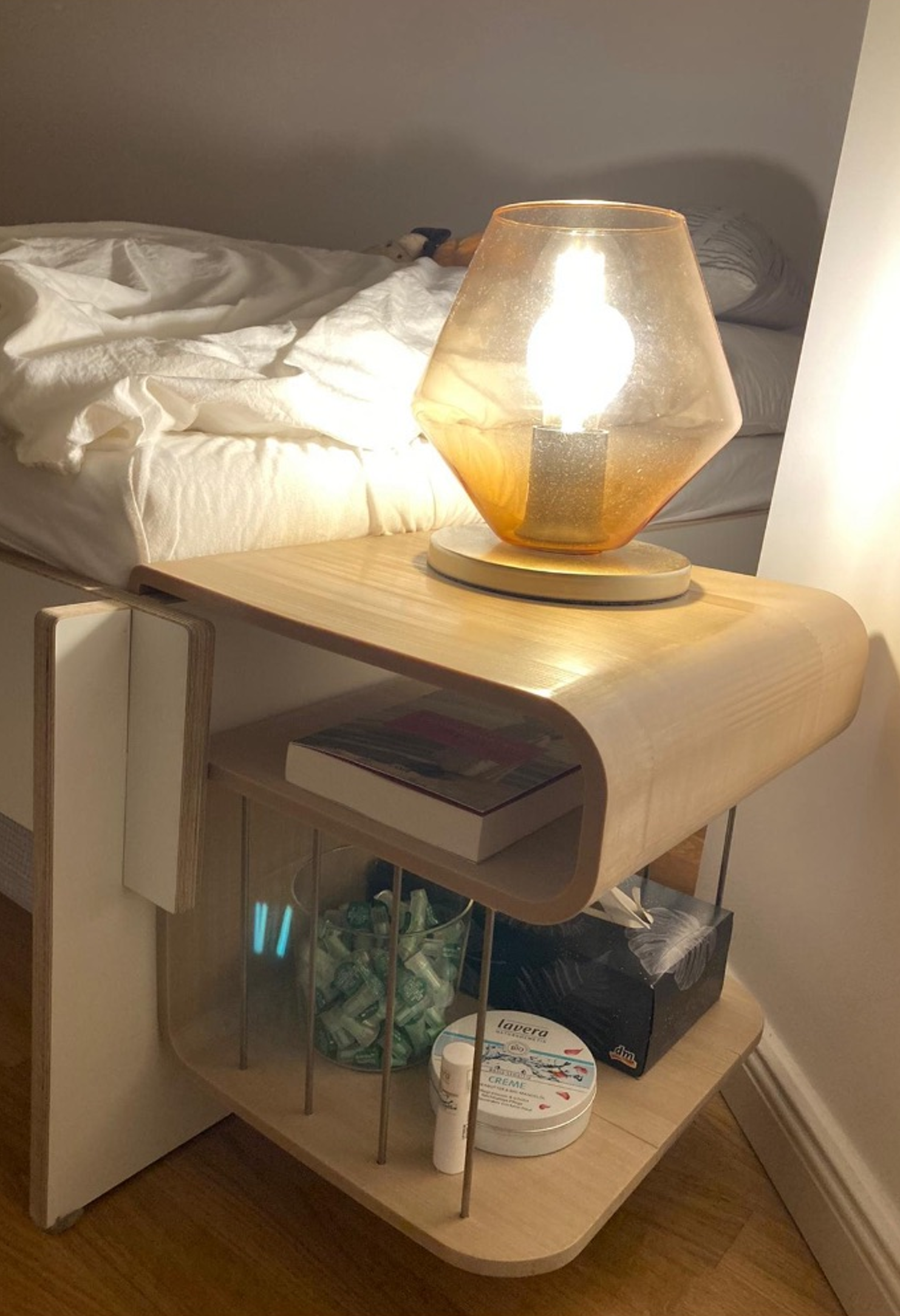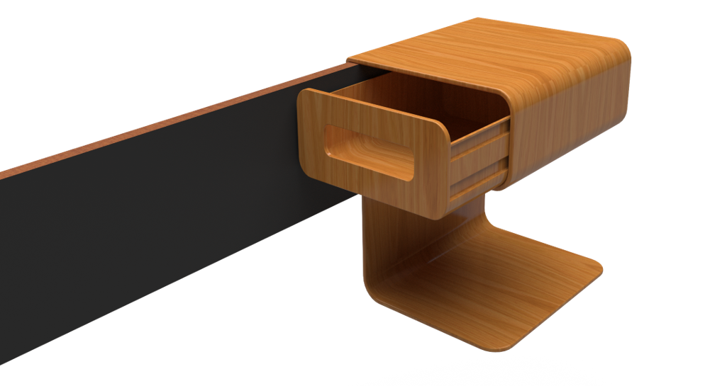 Ein Nachttisch, der dank des simplen und flexiblen Stecksystems an einer Vielzahl unterschiedlicher Betten gesteckt werden kann. Dadurch bietet er eine raumeffiziente und gleichzeitig elegante Lösung für kleine Wohnungen in der Stadt, deren Schlafzimmer wenig Platz haben.