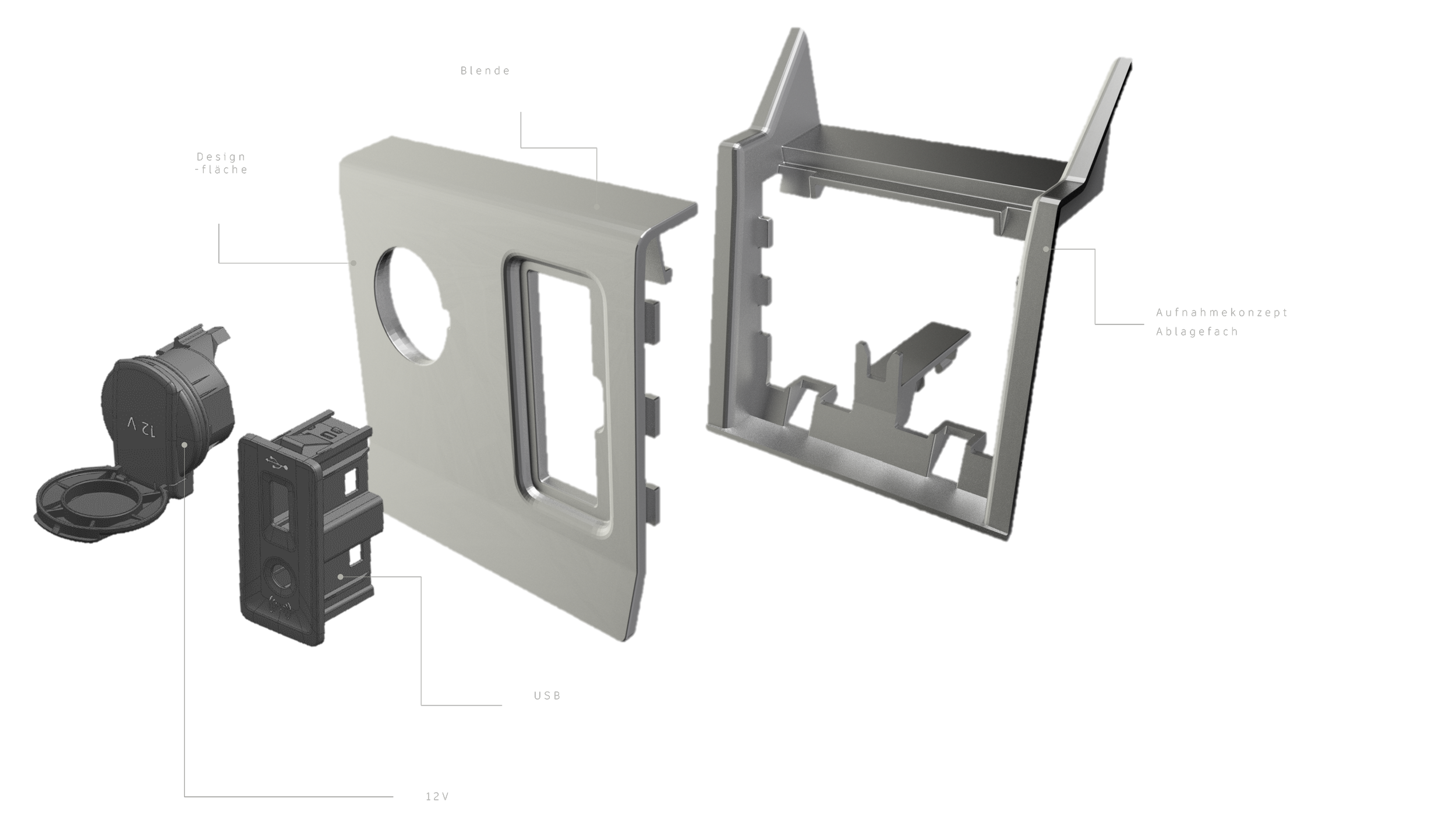 Den Ausgangszustand bildet ein bereits bestehendes Ablagefach einer MIKO*1, das sowohl eine Radioschnittstelle in Form eines USB- und AUX-Anschlusses, als auch ein 12-Volt-Steckdosenanschluss enthalten soll. Zur Fixierung dieser, vom zuständigen Zulieferer, bereitgestellten Elektronik-Einbauten, muss die sogenannte „Blende Ablagefach MIKO“ auf Grundlage einer vom OEM*2 vorgegebenen Designfläche konstruiert werden. Die Blende soll wiederum an einer im Ablagefach definierten Position verbaut werden. Durch die beschriebene Zielsetzung für die Blende und den gegebenen Ausgangszustand des Ablagefachs, ergibt sich ein zweiteiliges, aber zusammenhängendes Anforderungsprofil. Zum einen muss eine kunststoff spritzgerechte, beflockte*3 Blende aus dem Material PC-ABS*4, in der die oben genannten Elektronik-Komponenten befestigt werden sollen, konstruiert werden.